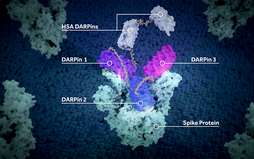 Ensovibep offers a differentiated approach to treating COVID-19 through a single molecule that can target up to three parts of the SARS-CoV-2 virus simultaneously to neutralize the virus through cooperative binding. This offers potentially broader efficacy and reduced potential for the development of viral drug resistance. All DARPins are produced through a rapid, high-yield microbial fermentation process.