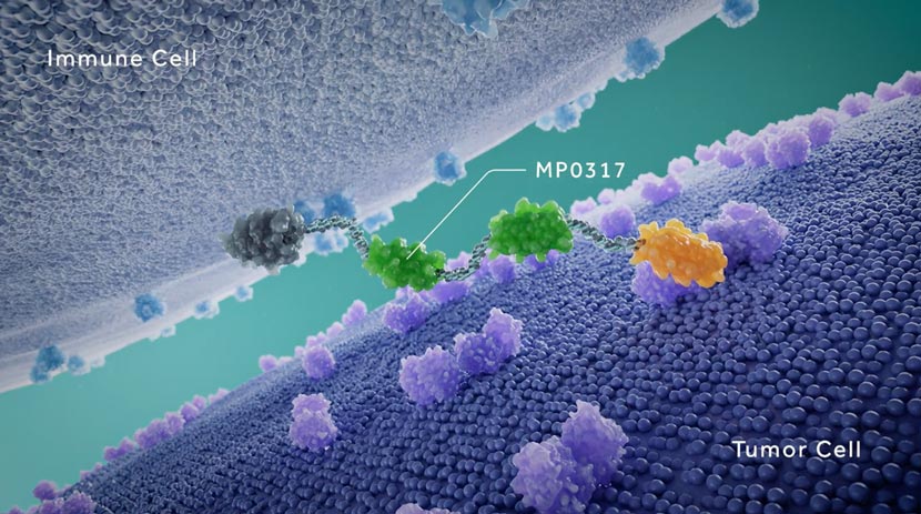MP0317 is a CD40 agonist designed to activate immune cells specifically within the tumor microenvironment by anchoring to fibroblast activation protein (FAP). This mechanism of action is proposed to enable immune activation directly in the tumor with fewer systemic side effects in patients.