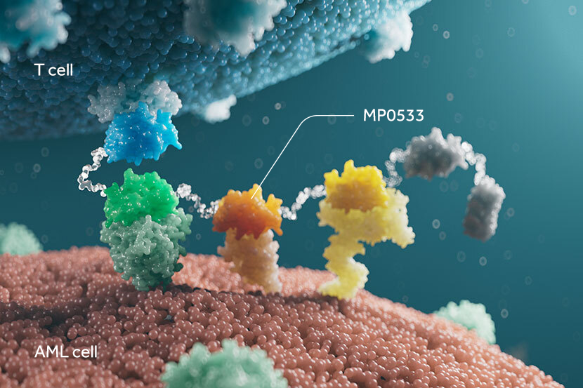 MP0533 is a novel tetra-specific DARPin therapy in clinical development for patients with acute myeloid leukemia (AML). It uses avidity-driven targeting to preferentially bind to AML cells and kills them through activation of T cells.